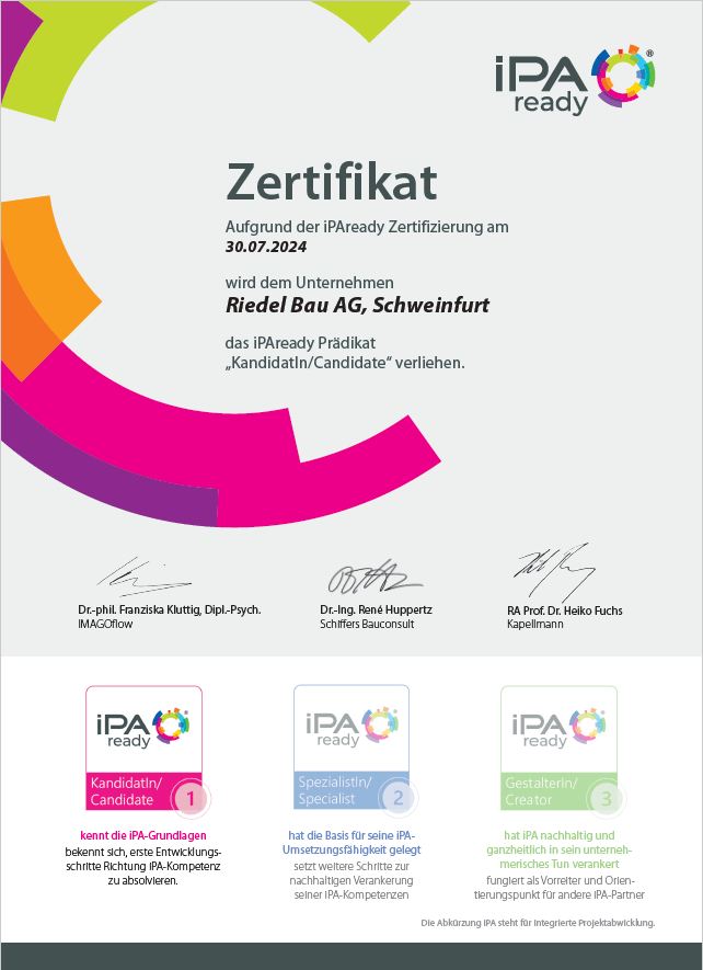 IPA steht für integrierte Projektabwicklung und bezeichnet ein Verfahren zur kooperativen und kollaborativen Durchführung von komplexen Bauprojekten. Um bei zukünftigen Bauprojekten IPA anwenden zu können, haben wir uns von iPAready prüfen lassen und die erste Stufe, das Zertifikat “IPA Kandidat”, erhalten.
