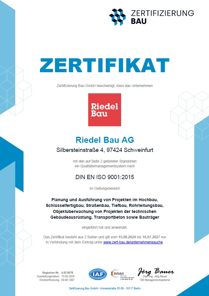 Riedel Bau ist von der Zertifizierung Bau GmbH nach dem Qualitätsmanagementsystem DIN EN ISO 9001 2015 zertifiziert. Seit mehr als 25 Jahren finden jährlich Audits zum Qualitätsmanagement statt, um unsere Organisation stetig zu verbessern.